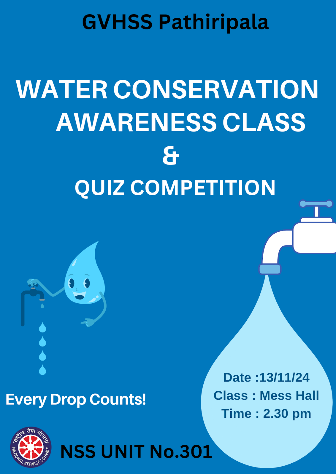 We conducted an awareness class related to Water Conservation on 13/11/24, Wednesday.The class was held at 2.30 PM in the Mess Hall for the students of 8.B and 8.K. A PPT to the need to conserve water was demonstrated.Then a Quiz Competition was also conducted on the instructions of Blue Army Club of NSS Training College.11 questions related to Water Conservation were asked.Children actively participated in the competition.The programme ended at 3.10 PM.